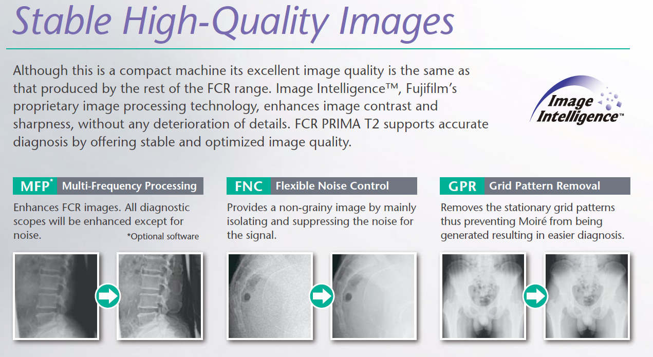 Although this is a compact machine its excellent image quality is the same as that produced by the rest of the FCR range. Image Intelligence™, Fujifilm’s proprietary image processing technology, enhances image contrast and sharpness, without any deterioration of details. FCR Prima T2 supports accurate diagnosis by offering stable and optimized image quality.